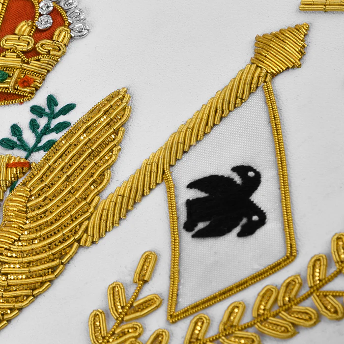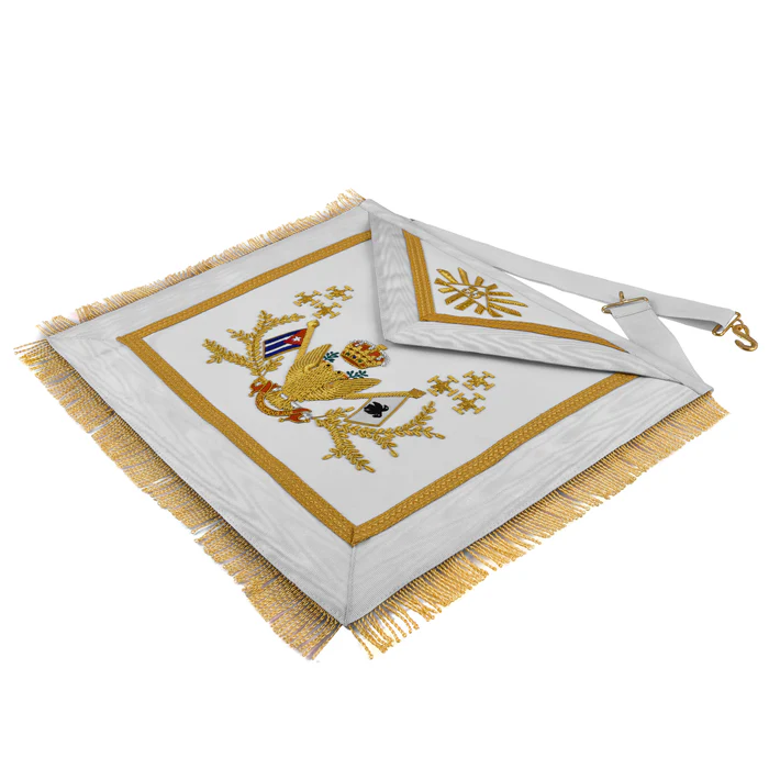 This 33rd degree apron is designed for Scottish Rite members, featuring intricate hand embroidery, gold bullion, wings up, and all countries’ flags. The adjustable belt and premium materials make it a valuable addition to your Masonic regalia.