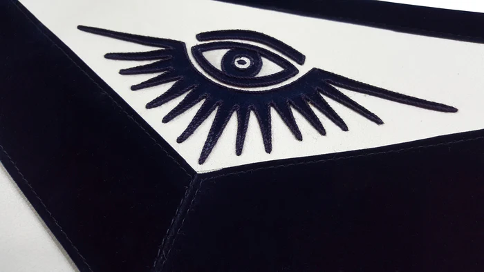 Exquisite Masonic Apron, Hand Embroidered With Black And White Silk Thread, Black Velvet Border, Adjustable And Stretchable Apron Belts, and matching black lining with pocket on back. Ideal for Masonic regalia and rituals.