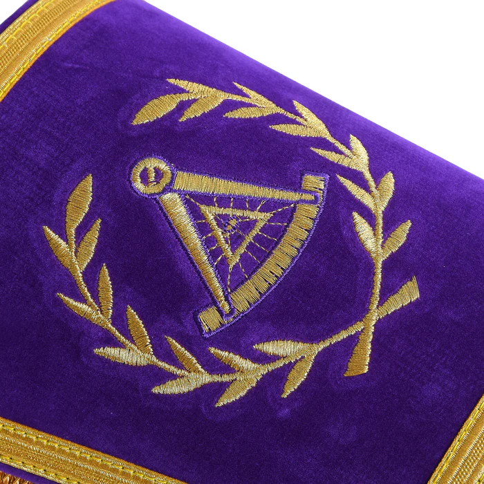 Enhance your Masonic attire with the Grand Master Blue Lodge Cuff, featuring expert hand embroidery in gold thread on rich purple velvet. The cuff is finished with white trim and fringe for added elegance.