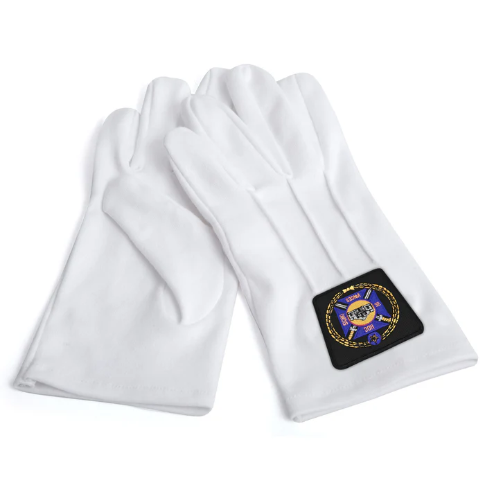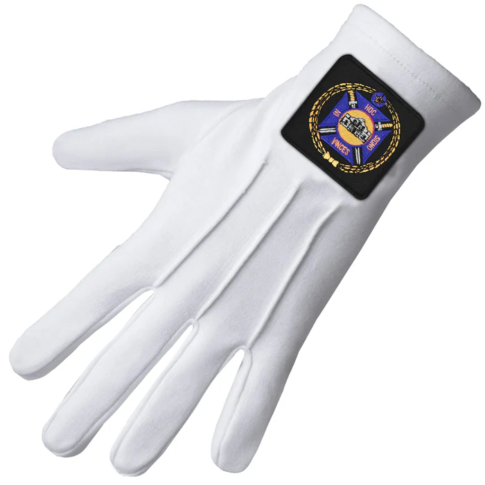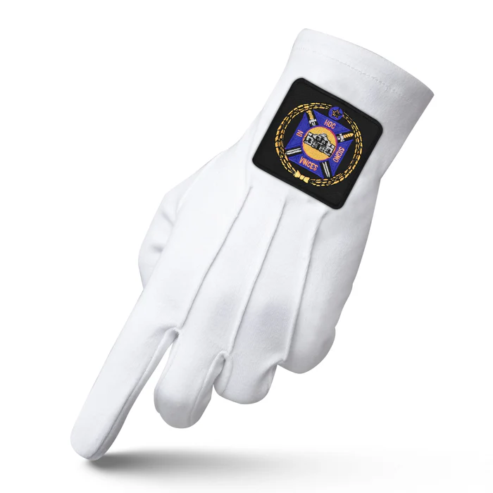 These Knights Templar Commandery Gloves are made from high-quality cotton with a classic white color, making them the perfect accessory for any Masonic occasion. The black patch, adorned with meticulous machine embroidery, showcases a sophisticated and intricate design. With impeccable stitching and a full-finger fit, these gloves offer exceptional comfort.