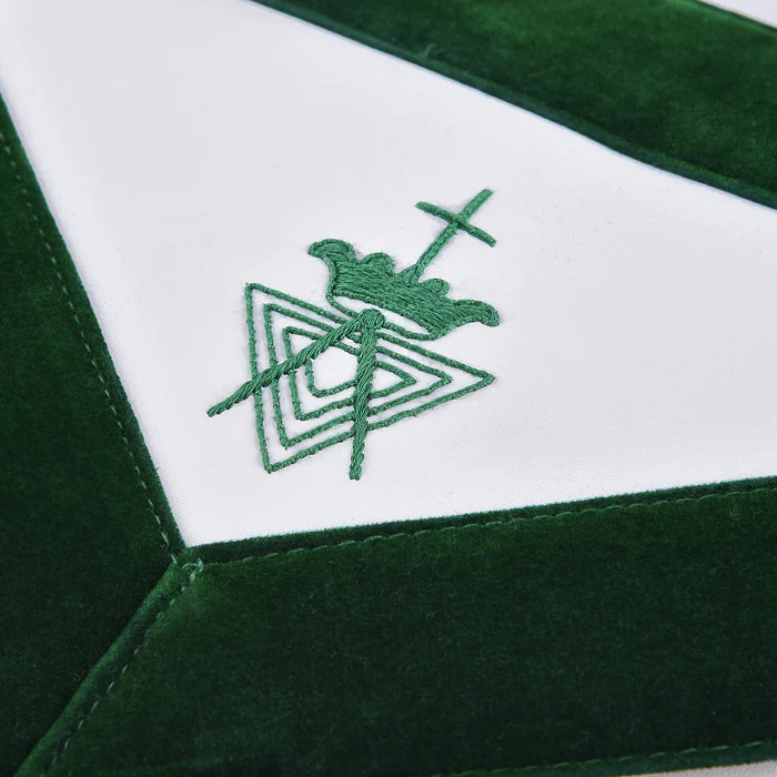 This apron is crafted with the highest standards of quality and workmanship, ensuring that it meets the expectations of members of the Masonic Order. The dark green ribbon border adds a touch of elegance to the design.