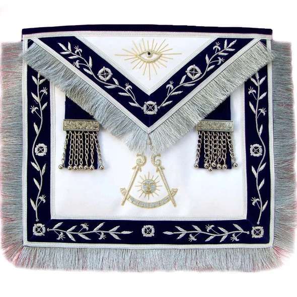 Past Master Blue Lodge Apron – Navy Blue with Silver Fringe Tassels Hand Embroidery