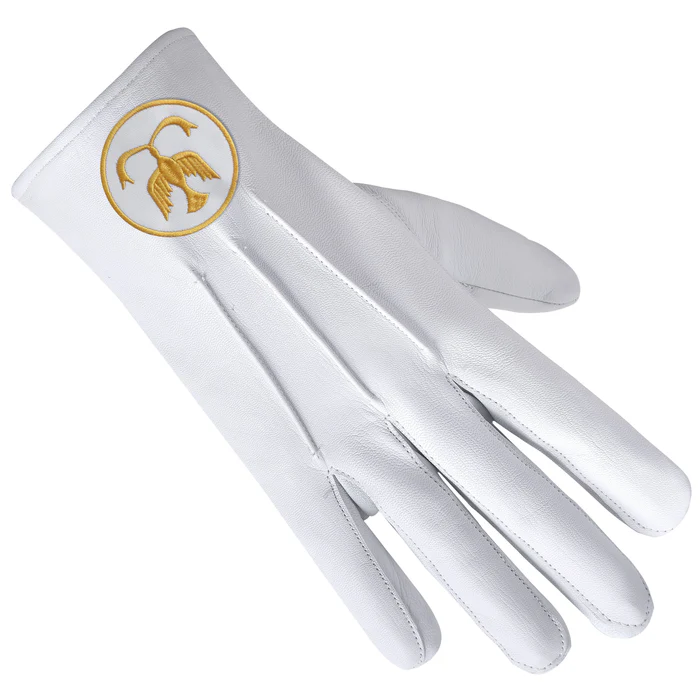 Elevate your Masonic attire with the Order Of The Golden Circle PHA Gloves, crafted from high-quality leather in a classic white color. These gloves are the perfect accessory for any Masonic occasion, featuring intricate machine embroidery with a gold emblem and excellent stitching.
