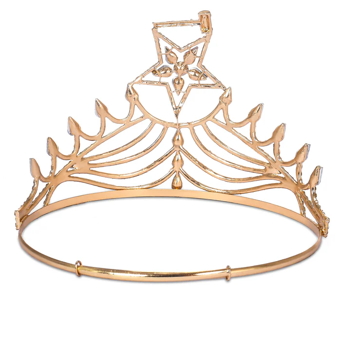 The Worthy Matron OES Crown is a beautiful and prestigious piece of formal regalia. Made of high-quality Rose Gold material, it features one large 5 Color Star with a Gavel at the top. This adjustable Crown is designed with crystal stones, adding to its elegant appearance.